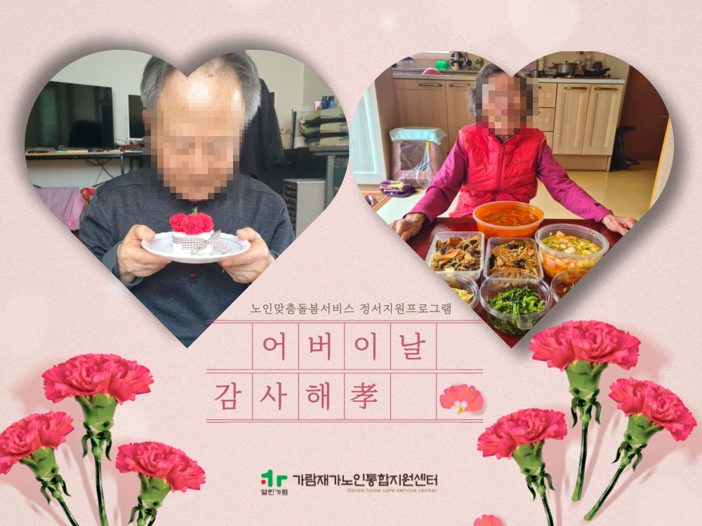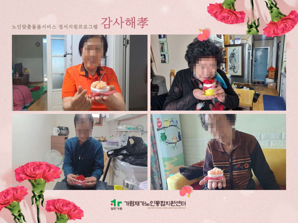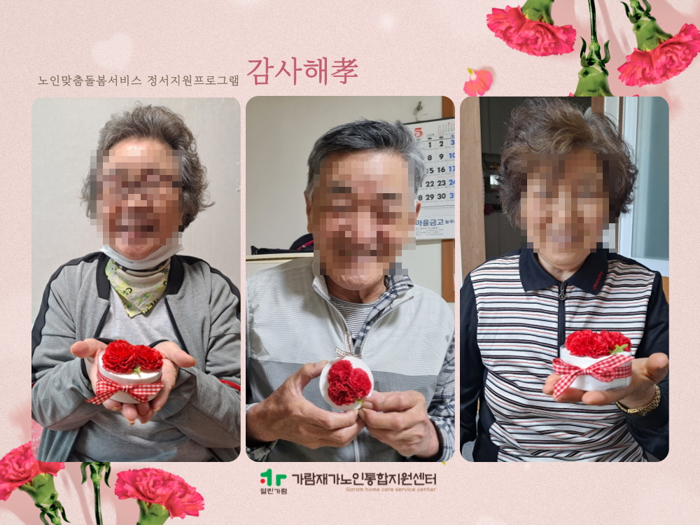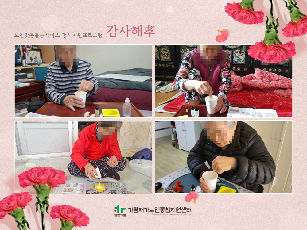 가람재가노인통합지원센터 인지정서지원프로그램 「어버이날 감사해효」 실시 가람재가노인통합지원센터 노인복지사업 0 656 2025.05.15 12:14 어버이날을 맞이하여 무연고 독거 어르신들께 카네이션 석고방향제 만들기와 영양가득한 상차림 키트를 제공하여 특별한 하루를 선물하였습니다.생활지원사와의 밀접한 상호작용 속에서 석고방향제 만들기 활동이 진행되었으며오감을 자극하는 특별한 작품 활동으로 완성품에 대한 성취감과 만족감을 경험하셨고영양을 고려한 맞춤형 상차림 제공을 통해 결식을 예방하고 부족한 영양을 채울 수 있어서전반적인 프로그램 만족도가 높게 나타났습니다.어르신들께서 더 많이 더 자주 따뜻하고 행복한 하루를 경험하실 수 있도록 더욱 노력하겠습니다.