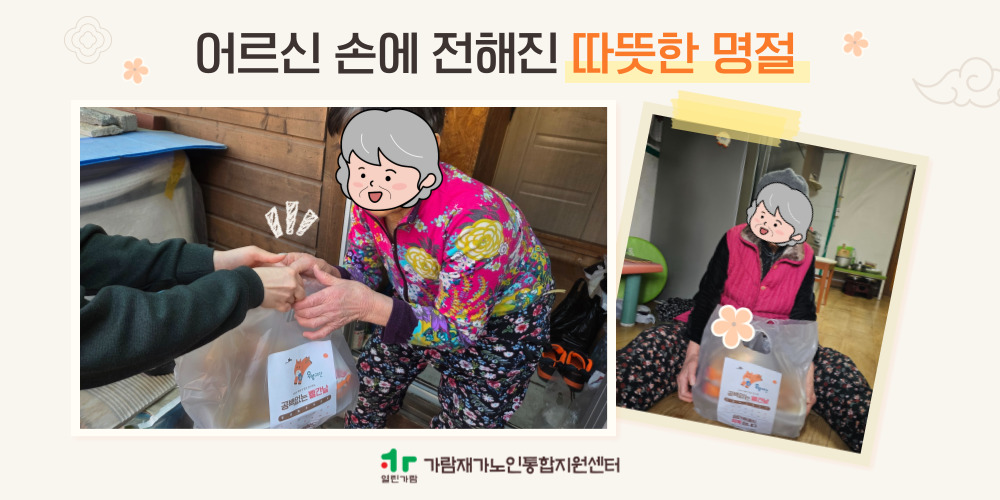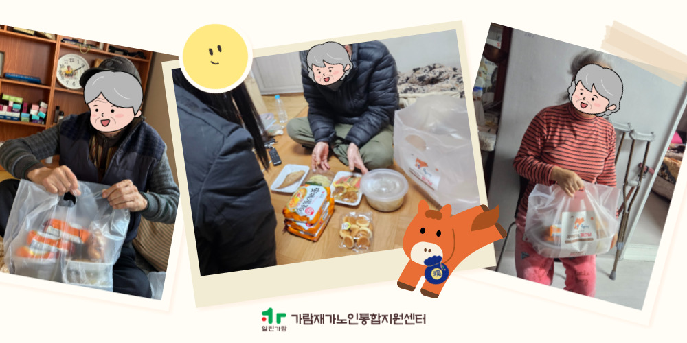 가람재가노인통합지원센터 우양재단 어르신 명절 먹거리 지원사업 '공백없는 빨간날' 가람재가노인통합지원센터 노인복지사업 0 130 02.20 13:16 가람재가노인통합지원센터 우양재단 2026년 어르신 명절 먹거리 지원사업 '공백없는 빨간날'2026년 설 연휴는 5일의 장기 연휴로 독거 어르신들에게 심각한 식사 공백이 발생할 우려가 커,우양재단의 후원으로 연휴 기간 드실 수 있는 명절음식을 준비했습니다.따뜻한 음식이 식지 않도록 자원봉사자분들이 발 벗고 나섰습니다.명절 연휴의 소중한 시간을 나누고, 어르신들을 위한 선물까지 마음을 담아 준비해 주셨습니다.조용했던 하루에 따뜻한 음식이 도착했습니다.긴 연휴지만 음식의 온기로 혼자가 아닌 함께하는 시간이 되었길 바랍니다.