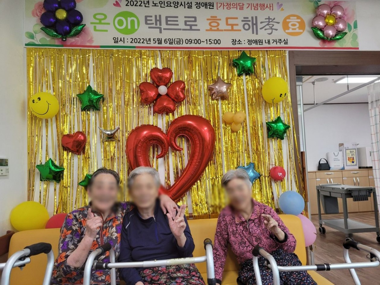 노인요양시설 정애원은 2022년 5월 가정의달 기념행사로 코로나바이러스-19로 인해 "온(On)택트로 효도해孝(효)"를 진행하였습니다.