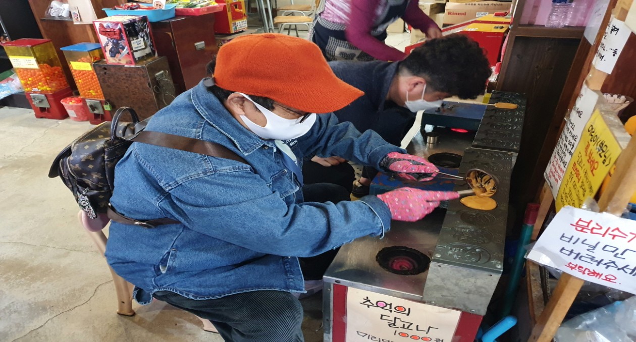 여고생 시절로 돌아가 역사관 관람도 하고 사진을 촬영하니 어르신들은 슬슬 배가 출출해졌습니다. “옛날 솜씨 한번 발휘해봐?” 호기롭게 어르신 한 분은 자리에 앉아 달고나 만들기에 돌입하시고 다른 한 분은 솜사탕을 만드셨습니다. 결과물은 대.성.공!