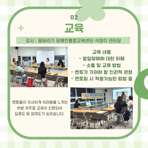 꿈바라기 장애인통합교육센터 석정이 센터장님을 모시고 발달장애인의 행동적 특성, 행동문제의 발생 원인, 심리적 상황, 소통방식의 변화 필요성, 멘토들이 가져야할 관점, 도전행동에 대한 대처방식 등에 대한 강의를 전달받았으며 해당 내용을 멘토링에 적용할 수 있도록 격려 및 응원받았습니다.