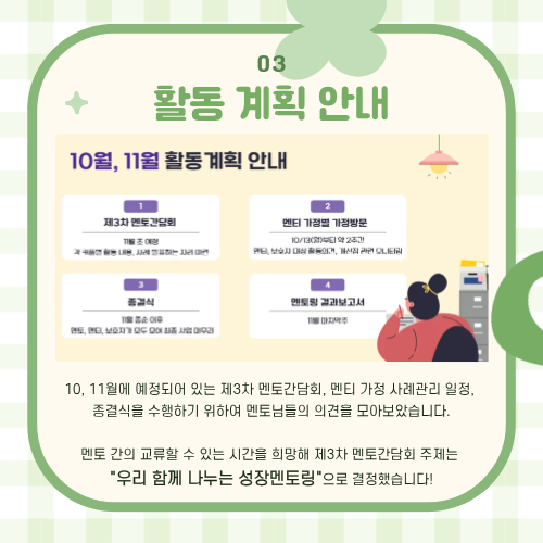 교육 이후에는 담당자가 10, 11월 사업 내용을 안내하였으며, 멘토들 간에 서로의 활동을 공유하는 시간을 가졌습니다.
