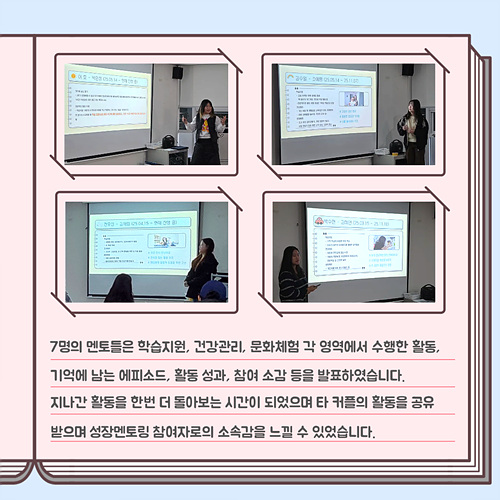 멘토가 그동안의 활동내용, 성과, 기억에 남는 에피소드 등을 발표하고 담당자가 제작한 활동영상을 시청하며 우리만의 발자취를 되돌아보는 시간이 되었습니다.