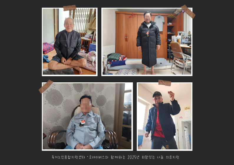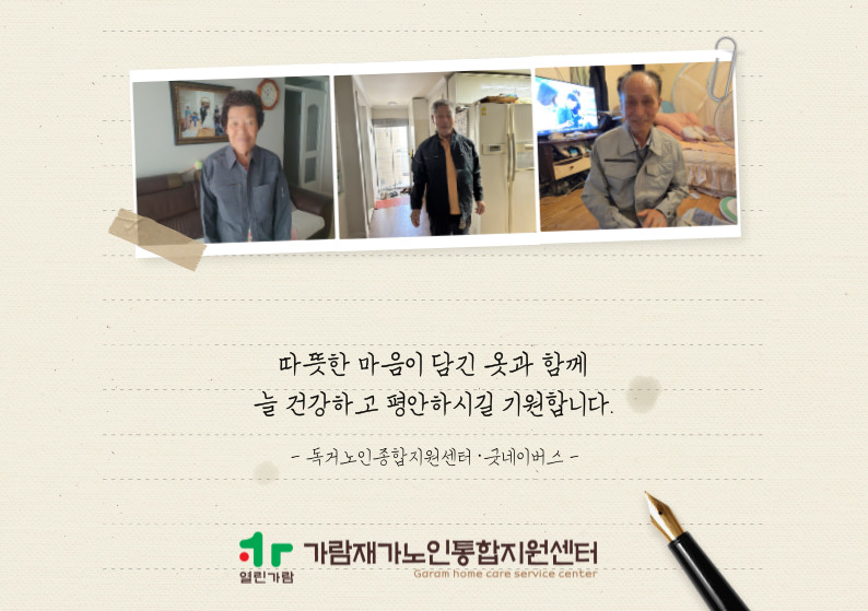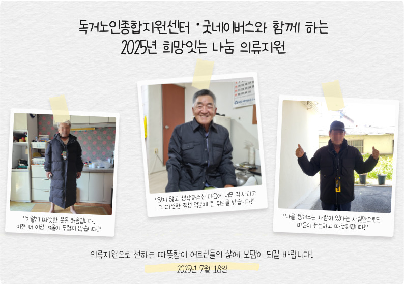 가람재가노인통합지원센터-독거노인종합지원센터⠐굿네이버스와 함께 하는 2025년 희망잇는 나눔 의류지원 가람재가노인통합지원센터 노인복지사업 0 541 2025.09.12 15:15 가람재가노인통합지원센터독거노인종합지원센터·굿네이버스와 함께 하는2025년 희망잇는 나눔 의류지원 독거노인종합지원센터⠐굿네이버스의 소중한 지원으로노인맞춤돌봄서비스 대상자 207명의 어르신들께 의류를 전달하였습니다어르신들께서는 '따뜻한 옷을 받으니 마음까지 포근해진다', '걱정이 줄어들어 한결 든든하다'며 고마운 마음을 전해주셨습니다.