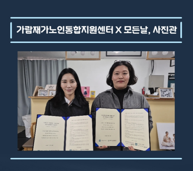 업무협약 체결(가람재가노인통합지원센터X모든날, 사진관) 가람재가노인통합지원센터 노인복지사업 0 18 04.06 11:40 업무협약체결가람재가노인통합지원센터 X 모든날, 사진관가람재가노인통합지원센터와 모든날, 사진관이 어르신들의 소중한 인생을 기록하기 위해 업무협약(MOU)을 체결했습니다.이번 협약을 통해 매달 2명의 어르신께 장수사진 촬영을 지원하며, 오랜 세월을 살아오신 어르신들의 아름다운 오늘을 정성껏 담아드릴 예정입니다.앞으로도 지역사회와 함께 어르신 한 분 한 분의 삶이 더 빛날 수 있도록 노력하겠습니다.