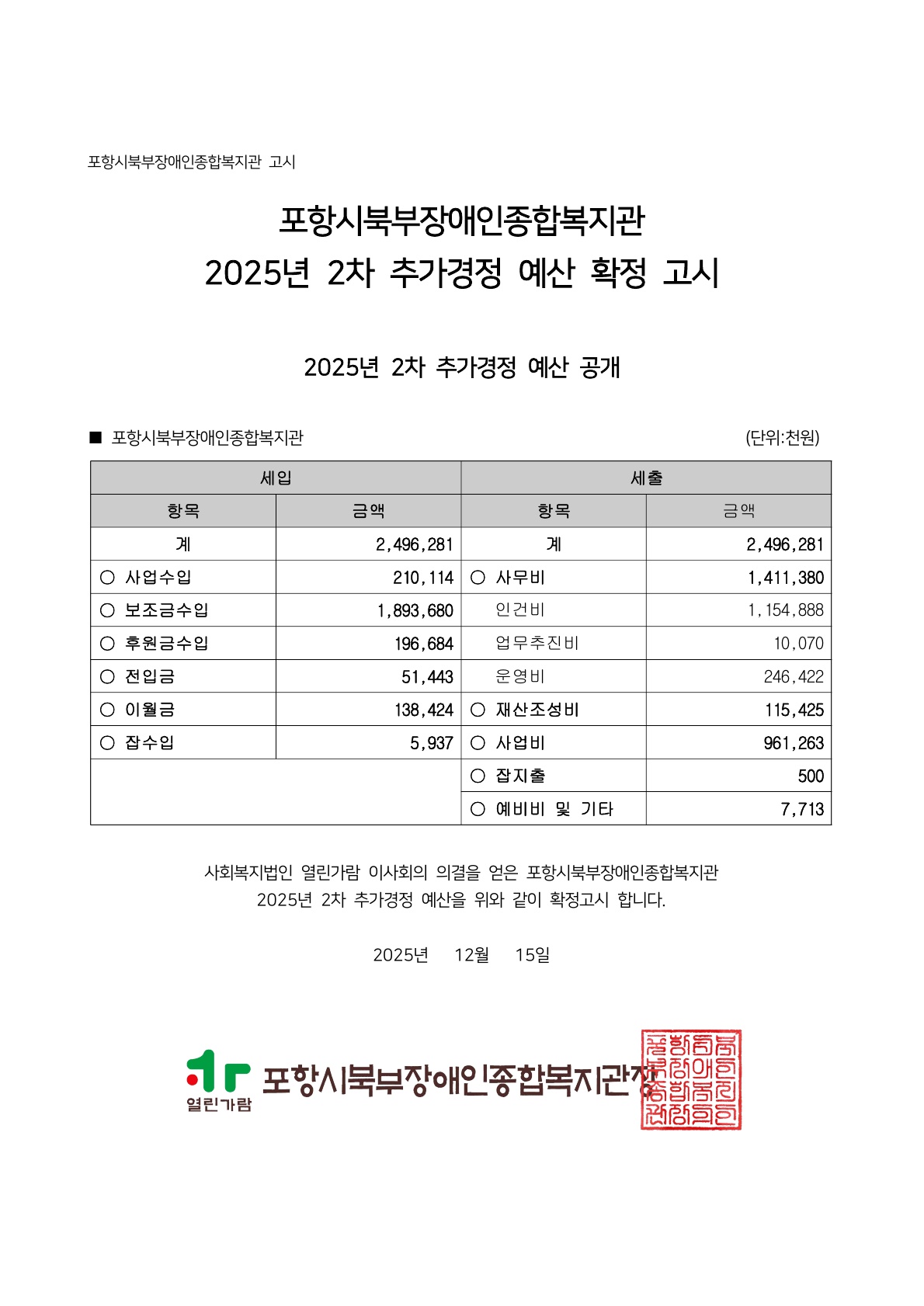 포항시북부장애인종합복지관 2025년도 2차 추가경정 예산 확정 고시 포항북부장애인복지관 0 195 2025.12.15 14:34 2025.12.15 14:34 2025년 2차추경 세부사업계획서 및 예산서포항시북부장애인종합복지관_공개.pdf (553.3K) + 3 {이미지:0}